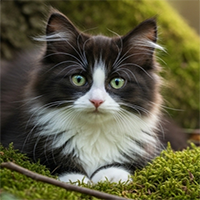 Wieselfeuer - schwarz-weißer Kater mit mittellangem, struppigem Fell und bernsteinfarbenem, kritischem Blick